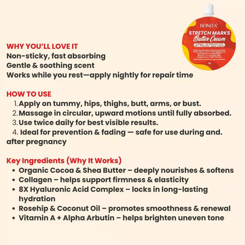 A rich, intensive stretch mark care cream that hydrates deeply, improves skin elasticity, and visibly fades stretch marks. Formulated to soothe, soften, and nourish skin while helping it stretch more comfortably — perfect during and after pregnancy , weight gain/loss, or growth changes.