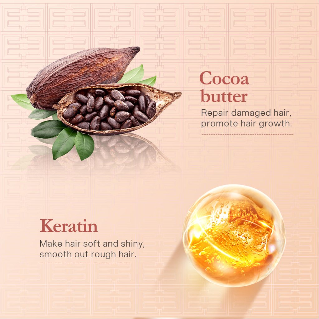 This product is Rich in cocoa butter and Multiple keratin ingredients, it penetrates into the hair core, double repairs hair, doubles the moisture of damaged hair, replenishes the lost nutrients of the hair, and enhances the softness and luster of the hair.