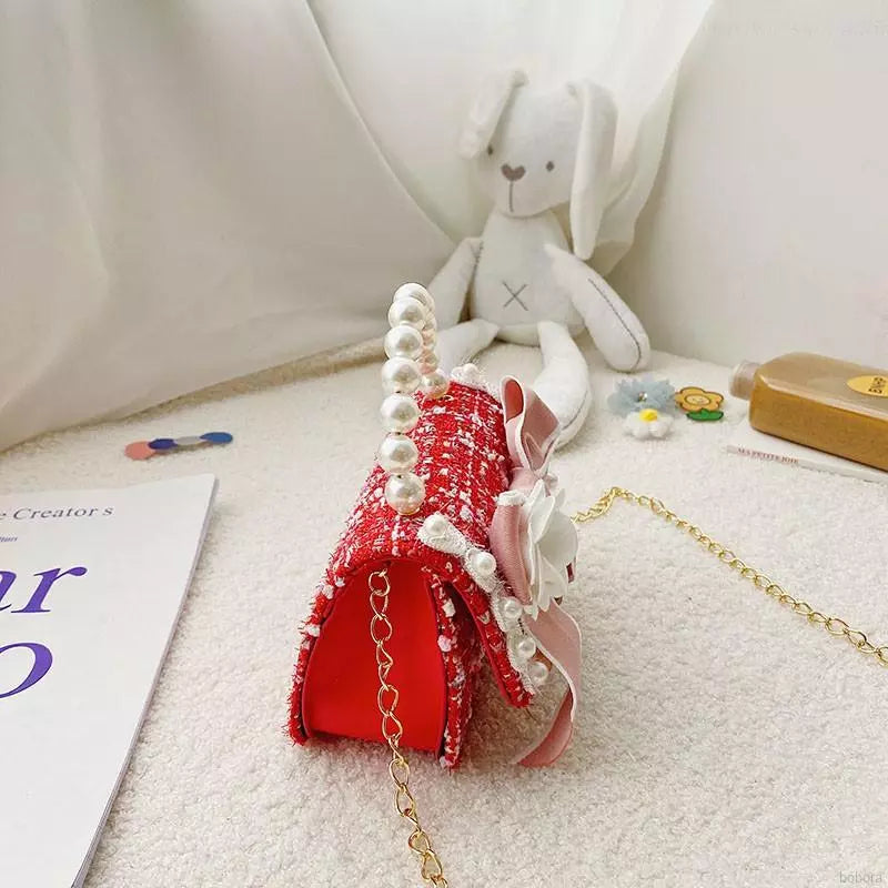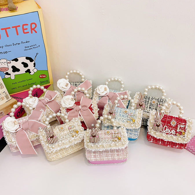 Add a touch of luxury and sweetness to your outfit with this pearl-handle tweed mini handbag, perfect for both kids and chic teens! Each piece is designed with elegant pastel tweed fabric, lace and pearl details, and finished with large satin bows or cute embroidery accents.